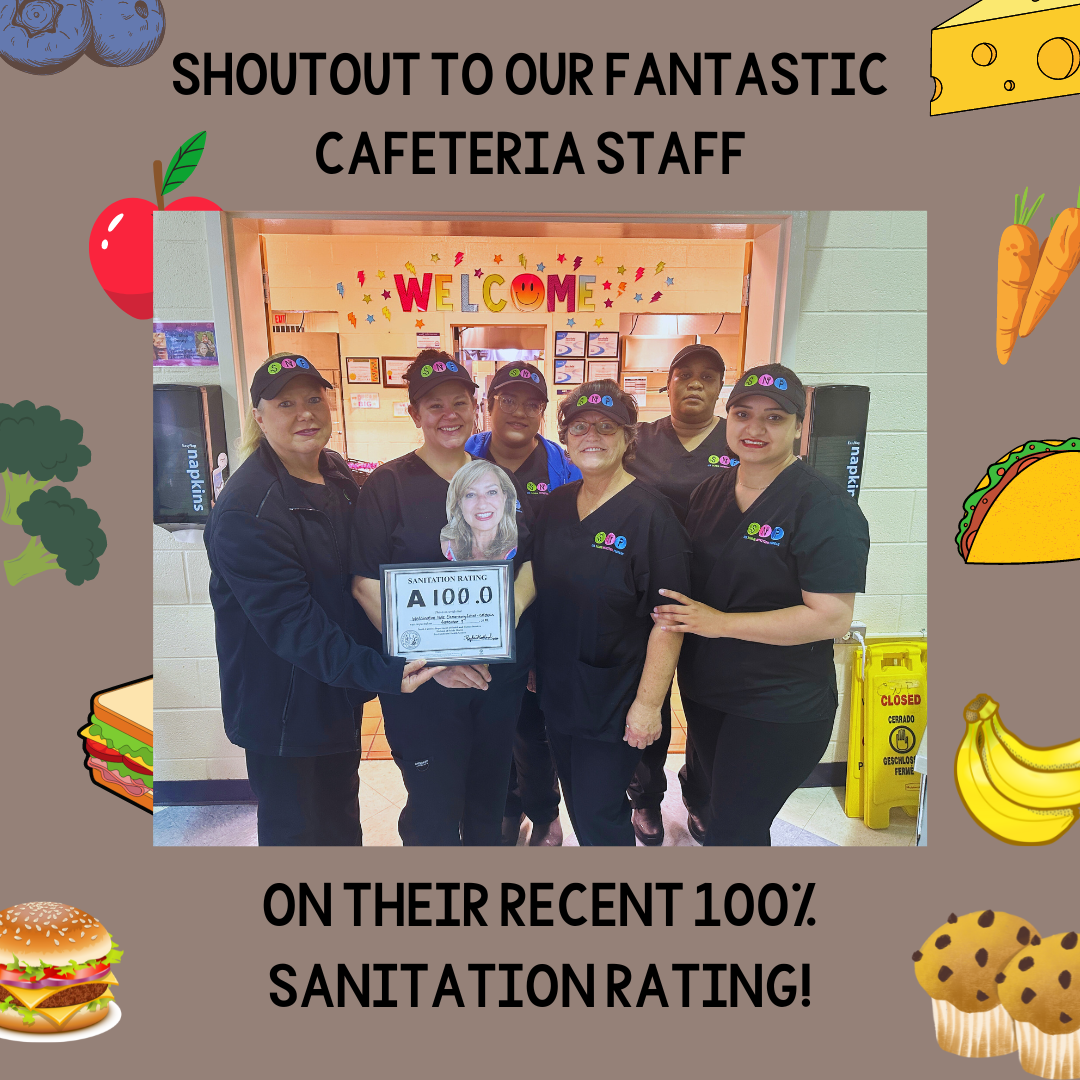 Shoutout to our fantastic Cafeteria Staff on their recent 100% sanitation rating!
